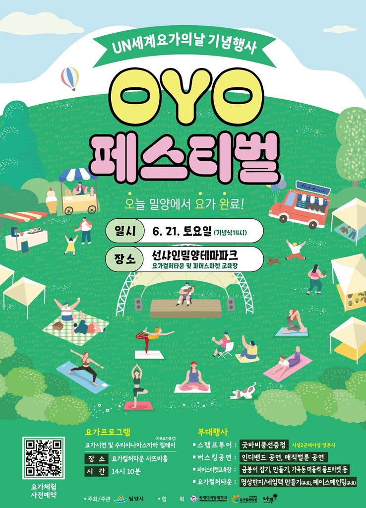 제11회 UN 세계 요가의날 기념행사「OYO 페스티벌」이 당일 우천 예보로 인해 기존 선샤인 밀양 테마파크 문화광장에서요가컬처타운 실내 공간으로 운영 장소가 변경되었음을 알려드립니다. 이번 행사에 많은 시민 및 관광객들이 참가할 수 있도록 붙임과 같이 안내 합니다.