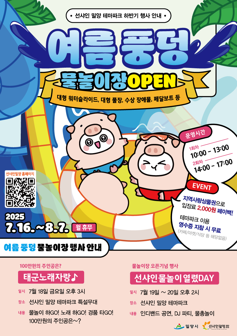 밀양시에서 밀양 최대의 야외 물놀이장인 여름 풍덩 물놀이장을 선샤인 밀양 테마파크에서 개장합니다.